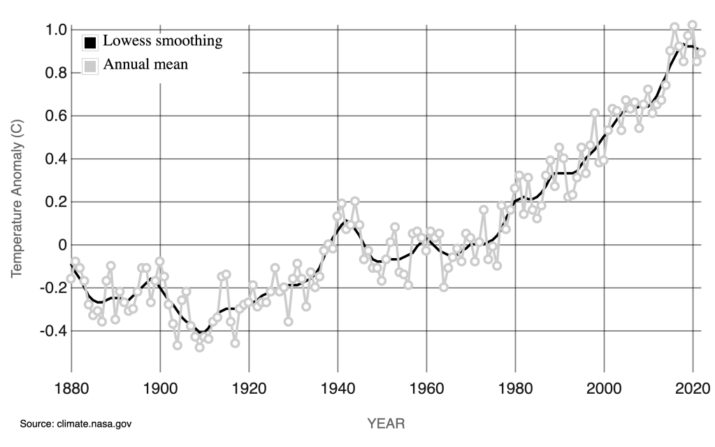 Furthermore, climate change does not mean that the global mean temperature is rising every single year. There is still variability from year to year because of the physics of the coupled ocean-atmosphere system. The hottest year on record was 2016 (although this may be eclipsed by 2023) – partly because of climate change and partly because of the extreme El Nino pattern in the global tropics – which tends to increase global mean temperatures. In 2020, 2021 and 2022, the tropics have been dominated by a “La Nina” pattern which tends to cool the global mean temperature – and yet, 2020, 2021 and 2022 all are among the top 7 warmest years. Longer term analysis shows a clear positive trend, despite this inter-annual variability with the average temperature in the last decade being more than 1 degree C or around 2F warmer than the pre-industrial mean temperature.