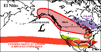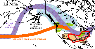 While the El Nino/La Nina phenomenon is centered in the tropical Pacific Ocean, it has global ramifications and alters the atmosphere-ocean dynamics around the world. There are number of well-understood and documented teleconnections to patterns of precipitation and temperature anomaly depending on the ENSO phase shown below: