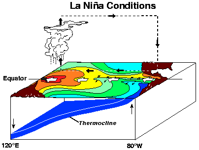 During the El Nino (warm) phase, easterly trade winds across the tropical Pacific weaken, sea surface temperatures in the Eastern tropical Pacific tend to be warmer and the center of convective rainfall shifts eastwards relative to neutral conditions. During the La Nina (cool) phase, the easterly trade winds intensify, sea surface temperatures in the Eastern tropical Pacific tend to be cooler and the center of convective rainfall shifts westwards relative to neutral conditions.