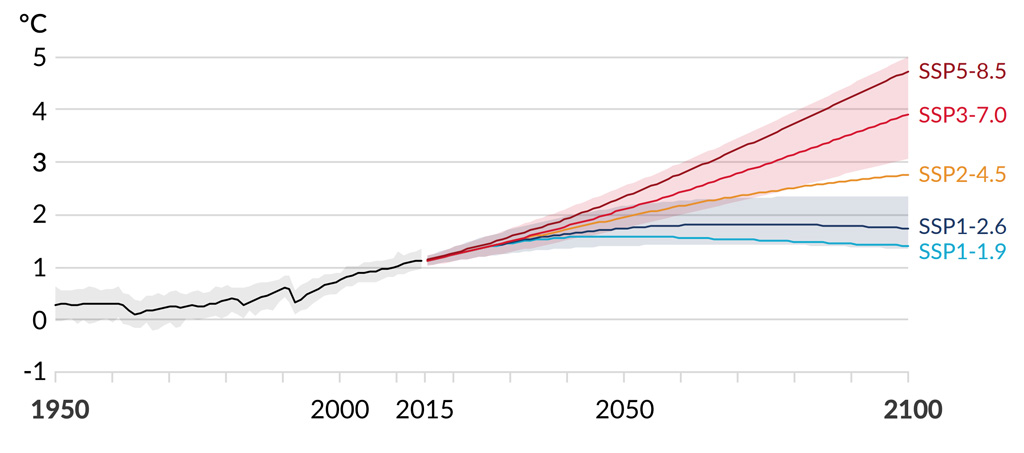 The projected global mean temperature effects of these SSPs are shown here