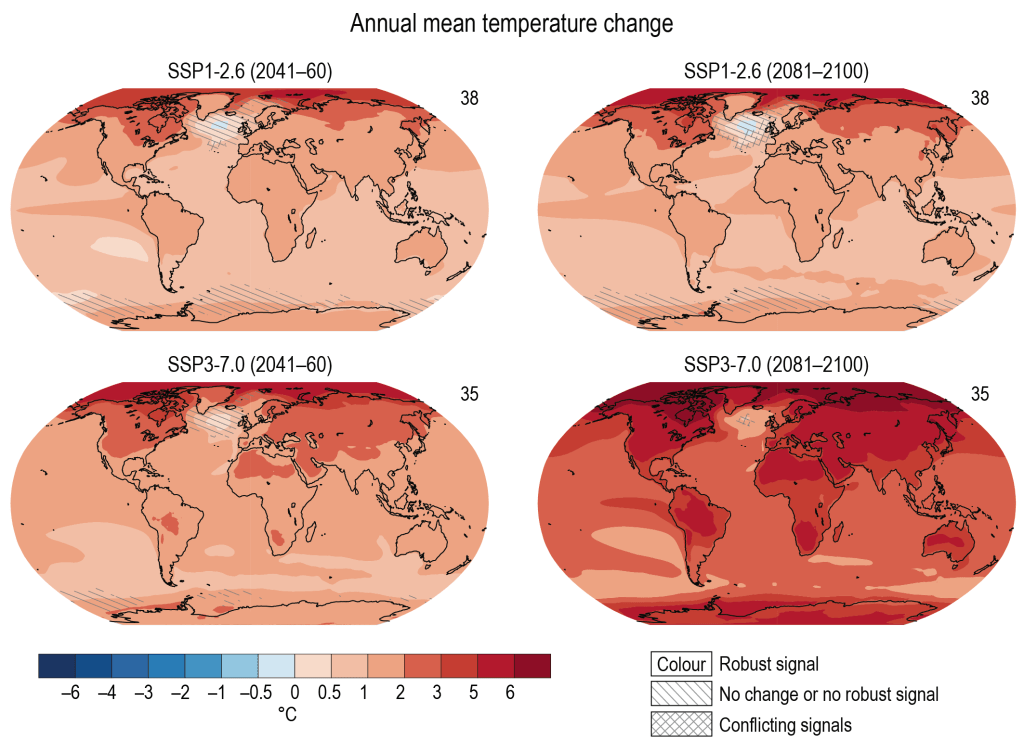 The projected spatial distribution of warming (relative to pre-Industrial levels) for two scenarios and two time horizons is shown in the maps below.