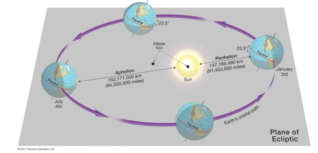 The most fundamental form of climate variability is the annual cycle of the seasons. The seasons occur the way they do because of the tilt of the Earth on its rotational axis and the nature of the Earth’s orbit around the Sun. The Earth’s orbit around the Sun is almost perfectly circular, but the Earth is tilted 23.5 degrees on it’s rotational axis. This combination of factors means that the tilt of the Earth’s orbit plays a much bigger role in determining the seasons than the planet’s proximity to the Sun. On other planets with less of a tilt and/or a more elliptical orbit around the star, the proximity to the star plays the larger role. The diagrams below show the position of the earth at the solstices, equinoxes, aphelion (furthest point from the Sun) and perihelion (point of closest approach to the Sun).