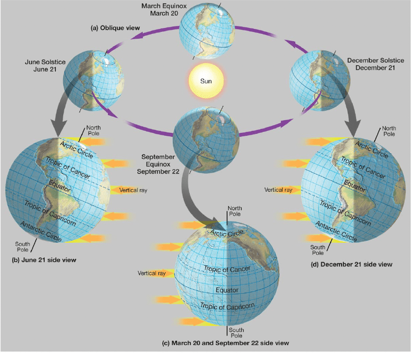 On December 21st, the Sun’s rays shine more directly on the southern Hemisphere and the “effective equator” is the Tropic of Capricorn at 23.5 degrees S – hence this is the height of southern Hemisphere summer. On June 21st, the Sun’s direct rays shine more directly on the northern Hemisphere and the “effective equator” is the Tropic of Cancer at 23.5 degrees N – hence this is the height of northern Hemisphere summer.