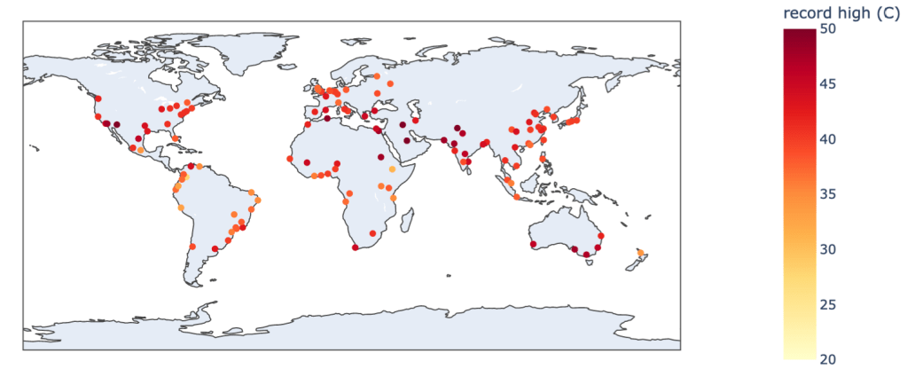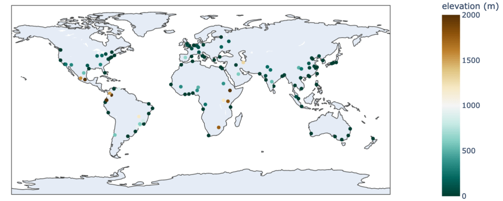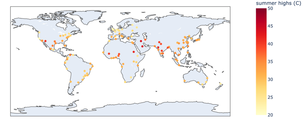 Note that while for most cities in the northern hemisphere this is July/August and for most cities in the southern hemisphere this is January/February, there are a number of cities with strong monsoonal rainfall during the hemispheric summer (particularly in the northern hemisphere) which suppress the temperatures at that time of year, so the typical period of peak temperature is several months earlier (eg. April to early June). There are also cities in the “bimodal” precipitation regions that experience peak temperatures during the drier times of year.
