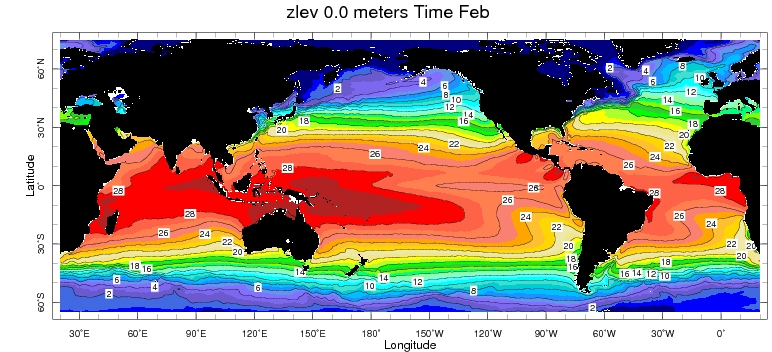 Here is the 1991-2020 global sea surface temperature for February and August, respectively, from the NOAA National Climatic Data Center (NCDC) AVHRR Optimum Interpolation SST (OISST) dataset.