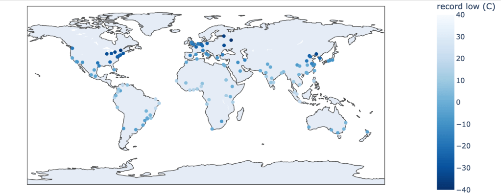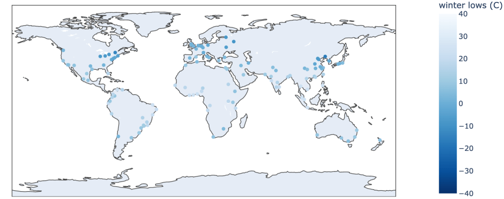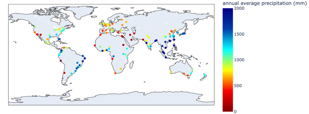 There are eight cities with average annual precipitation amounts in excess of 2000 mm. They are all colored in dark blue and are Recife, Brazil; Mumbai, India; Dhaka, Bangladesh; Singapore; Kuala Lumpur, Malaysia; Taipei, Taiwan; Hong Kong, China; and Manila, Philippines. Again, I’ve chosen to use the colorbar to span the range from 0-2000 mm to give more granularity to the cities in that range.
