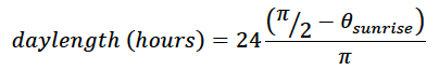 The daylength in hours is 24 multiplied by the ratio of the arc length in daytime to the total circumference of the circle. The total circumference of the circle is 2*pi. The arc length in day time is 2*(pi/2-thetasunrise). So the resulting daylength in hours is