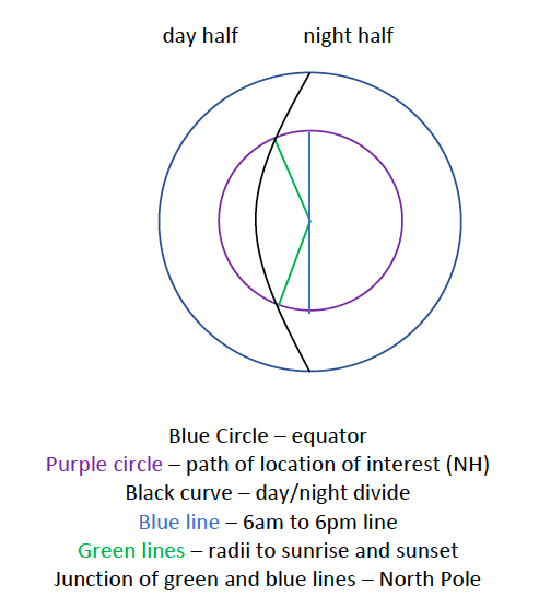 While this is a first approximation, it isn’t quite accurate, because the location of interest rotates around a circle on a slant in three dimensional space over the course of the day. That slant is depicted in 2d profile by the purple line. But if we then look “down” on the earth from a polar view and consider the path of the latitude of interest, it describes a circle, but the day/night divide is not in the “center” because the North Pole is experiencing permanent night at this time of year. The figure below describes the scenario (again considering the Sun to be to the left).