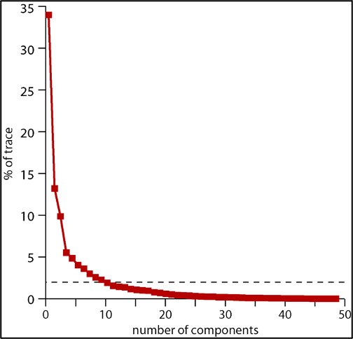 The first principal component always explains the most variance, the second, the second most, etc.. The two diagrams below display for a particular PCR analysis, how much of the variance is explained by each successive mode (upper figure) and the cumulative variance in the predictand explained by all the modes up to that point (lower figure). These “scree plots” can then be used to determine a “stopping rule” regarding how many modes to select.