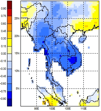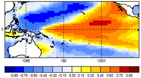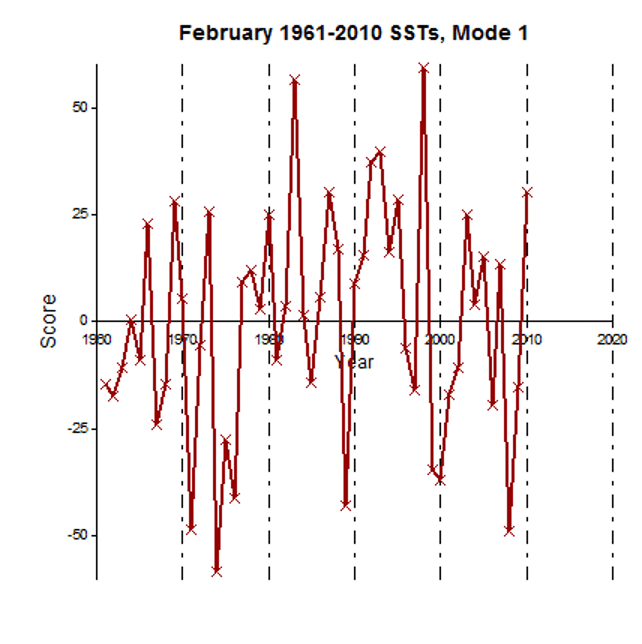 An example of such a pattern is shown in the diagram below based on a PCR of Pacific sea surface temperatures predicting an index value of rainfall over Thailand.