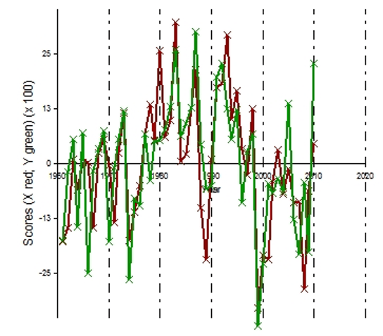 When these weights are multiplied by the actual observations for the given years, a time series of scores is the result as shown below.