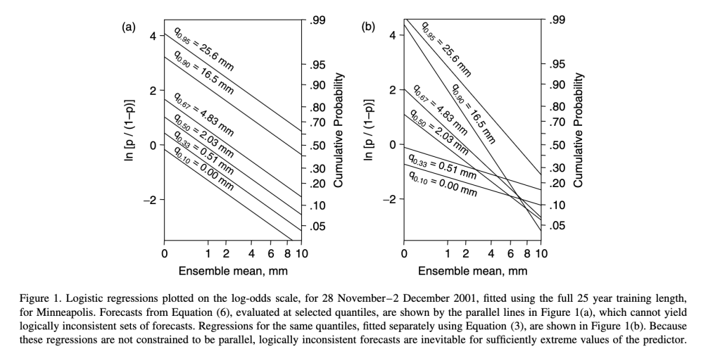 However this formulation has a problem in that it can lead to nonsense/contradictory results – where the cumulative forecast probability of a wet outcome takes a lower probability value than the cumulative forecast probability of a drier outcome. This situation can arise because the regression coefficients for each quantile are determined independently, so the slopes of the regression quantiles can cross each other. This is illustrated in the right half of the diagram below from a paper by Daniel Wilks 2009 in Meteorological Applications. The left side of the same diagram illustrates the outcome of using the “Extended Logistic Regression” method that Wilks formulated and applied to a forecasting context.