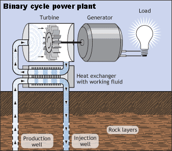 Two of the common types of geothermal plants are a flash steam plant and a binary cycle geothermal plant. Flash steam plants typically involve a lower water pressure than normal to produce steam and binary cycle geothermal plants can use moderately warm water to heat a secondary fluid with a lower boiling temperature. In either case, the steam that is generated then drives a turbine to produce electricity as depicted in the schematic diagram below.