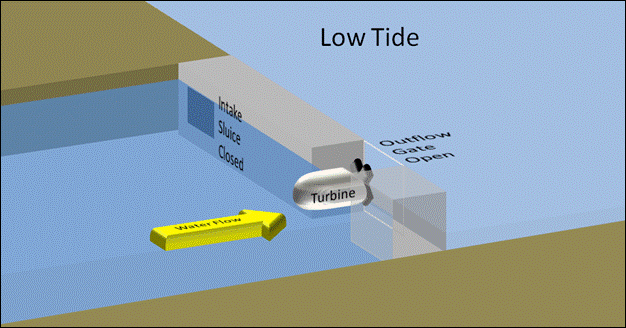 A basic schematic diagram and description of a tidal barrage system is shown below