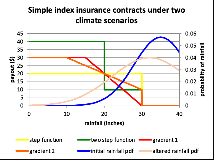 Index insurance has potential as an adaptation tool in the developing world where insurance infrastructure is limited or non-existent. It can enable farmers to take riskier, but potentially higher yield decisions that can alleviate poverty in the long run. Index insurance contracts can be designed with different possible payout functions. Four potential payout functions are depicted in the graphic below for drought/low rainfall index insurance involving an initial climate (with a wetter mean and smaller standard deviation) and an altered climate (with a drier mean and a larger standard deviation).