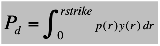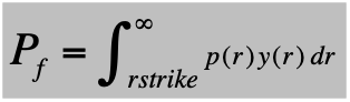For a rainfall-based drought contract, the actuarially fair premium would determined by the equation below, where p(r) is the probability of rainfall amount r, y(r) is the payout as a function of rainfall r and rstrike is the threshold or strike level at which the contract first pays out. The integration interval is bounded by 0 (minimum possible rainfall) and rstrike because for all larger rainfall levels, there is no payout.