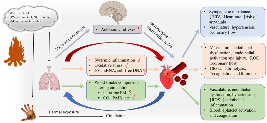 Heat and drought induced wildfires can also lead to significant public health impacts on cardiovascular and respiratory systems – as recent severe wildfire seasons in many regions have clearly demonstrated. Wildfire smoke can create systemic inflammation, heighten asthma risk, complicate cardiovascular diseases and strain respiratory systems and can have other impacts on blood chemistry and the nervous system as the diagram below illustrates.