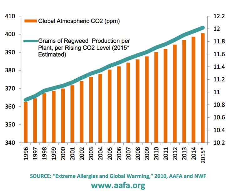 Systemic climate changes and changes in atmospheric carbon dioxide also tend to produce conditions favorable for the intensification of aero-allergens. Warmer conditions year round tend to lead to longer pollen seasons and higher pollen counts in the air for many allergens. The graph below shows the trend of ragweed concentration and the global CO2 concentration.