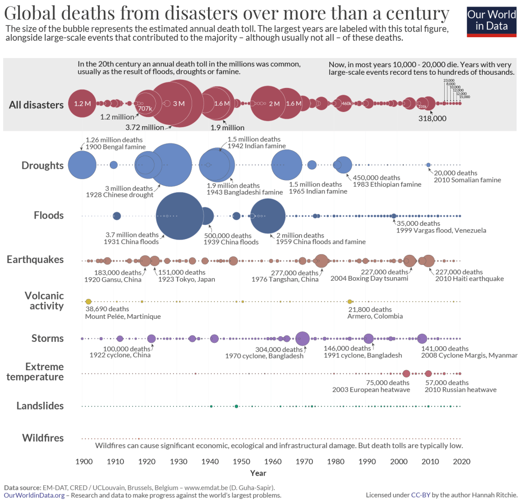 But all in all, globally, the average number of lives lost per storm in severe storms has had a tendency to decline over the long run. The diagram below shows the number of casualties from all natural disasters from the last century.