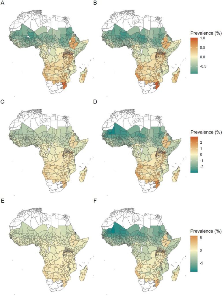 Globally, of all the vector borne infectious diseases, malaria is the most deadly. While widespread mosquito spraying campaigns have largely eliminated the risk of malaria transmission in places like the US and Europe, and there is now a recently developed vaccine against malaria that may help to significantly reduce risk, over 200 million people are infected with malaria annually and in a typical year over half a million die from the disease (mostly young children in very poor settings – particularly in Africa). As temperatures rise and precipitation patterns change, the areas suitable for malaria transmission and mosquito breeding evolve and may increase. The figure below shows modeled changes in malaria prevalence in Africa in the mid and late 21st centuries on the basis of three climate change scenario story lines. Subfigures A C and E show the modeled malaria prevalence around 2050 and B, D and F show the modeled malaria prevalence around 2100. The top two maps (A and B) are for the low emissions scenario (RCP 2.6), the middle two (C and D) are for the intermediate emissions scenario (RCP 4.5) and the bottom two (E and F) are for the high emissions scenario (RCP 8.5). Note the scale changes for the different emissions scenarios.