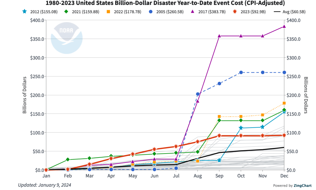 However, as severe storms are getting more severe, may be getting more numerous and as more people are living in vulnerable areas, the total economic value at risk has been steadily increasing – so the frequency and total losses of billion dollar meteorological disasters has been steadily rising. The figure below shows the costs of billion+dollar disasters in the US from 1980 to 2023.